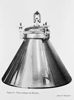 In seinen späteren Jahren galt sein Hauptinteresse der Meeresbiologie. Er leitete mehrere Forschungsexpeditionen im Atlantik, darunter 1889 die Plankton-Expedition der Humboldt-Stiftung. Dabei bereicherte er die Planktonforschung und die Fischereiforschung um quantitative statistische Methoden. In der Fischereiforschung entwickelte er ein Netz für Fischeier, erkannte die Möglichkeit, das Alter von Fischen an ihren Otolithen zu erkennen, und entwickelte so quantitative Methoden zur Charakterisierung der Fischbestände. In seinem Netz für Fischeier fand er auch weitere Kleinstlebewesen, für die er 1887 den Begriff Plankton prägte. Mit speziell von ihm entwickelten feinmaschigen Seidennetzen filterte er das Plankton aus einer 200 Meter hohen Wassersäule von 0,1 Quadratmeter Fläche. Durch die Entnahme von Stichproben an vielen Stellen des Ozeans konnte Hensen das Gesamtaufkommen an Plankton in der obersten 200 m dicken Wasserschicht abschätzen.[5] Er gilt deshalb als „Vater der quantitativen Plankton-Ökologie“.[6] Hensens neuartige Herangehensweise und seine daraus abgeleiteten Schlüsse wurden in Fachkreisen kontrovers diskutiert. Als prominenter Kritiker trat Ernst Haeckel in Erscheinung.[7]