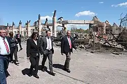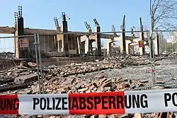 In der Nacht zum 22. April 2015 brannte sie aus zunächst unbekannter Ursache bis auf die Grundmauern nieder.[6] Einen Tag später gestanden drei Jugendliche die vorsätzliche Brandstiftung, nachdem bei einem der Täter ein Handyvideo des Brandes aufgetaucht war.[7] Im November 2015 wurde gegen die drei Jugendlichen von der Staatsanwaltschaft Anklage erhoben. Sie schätzt den entstandenen Schaden auf eine Million Euro. Den Ermittlungen zufolge wurden 13 umliegende Objekte – Gebäude, Fahrzeuge und anderes – durch das Feuer beschädigt.[8] Die drei Täter im Alter von 15, 18 und 20 Jahren haben die Tat gestanden und wurden im Oktober 2017 zu Bewährungsstrafen verurteilt.[9]