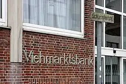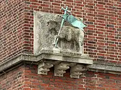 Oberhalb der Schalterhalle der Bank befindet sich an der Ecke zur Straße Auf dem Reuterhamm ein Zunftzeichen bzw. -wappen der Fleischer/Metzger/Schlachter. Das Lamm Gottes wurde aus Stein gehauen, die Siegesfahne ist offensichtlich aus Kupfer gefertigt.