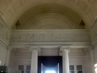 Der Architrav stützt sich auf je sechs ionische Säulen, die das Mittelschiff von den Seitenschiffen trennen, und je 2 ionische Säulen an den Schmalseiten. Darüber ist der Vierjahreszeitenfries angebracht. Der fast einen Meter hohe Fries hat eine Gesamtlänge von rund 65 Metern, die sich mit je 25 Meter auf die Längsseiten und je 7,5 Meter auf die Schmalseiten verteilt.[1]