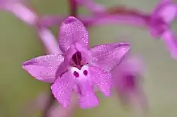 Die zwittrigen Blüten sind zygomorph und dreizählig. Die Blütenhüllblätter sind rosafarben bis purpurrot oder weiß. Die beiden seitlichen Blütenhüllblätter sind schief-eiförmig und stehen in einer Ebene mit dem oberen Blütenhüllblatt und der Lippe. Die Lippe ist tief dreilappig bis fast ungeteilt, 6 bis 8 Millimeter lang und 6,5 bis 10,5 Millimeter breit. Die Lippe ist im Zentrum heller und trägt am Grunde zwei oder drei sichtbare und zwei im Sporneingang verborgene weinrote Punkte. Der Sporn ist stecknadelförmig, waagrecht oder leicht abwärts gebogen und deutlich länger als der Fruchtknoten. Der gedrehte Fruchtknoten ist 9 bis 11 Millimeter lang.[2]