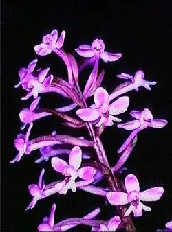 Der endständige, traubige Blütenstand ist bei einer Länge von 3 bis 15 Zentimetern zylindrisch und enthält locker verteilt 8 bis 35 Blüten. Die rotvioletten Tragblätter liegen dem gedrehten Fruchtknoten an und sind etwa so lang oder länger als dieser.