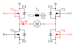Der Tiefsetzsteller-Betrieb dient zum Antreiben, der Motor nimmt Leistung auf. In der dargestellten Schaltung wird dazu T4 durchgeschaltet und auf T1 ein PWM-Signal gelegt. Leitet T1, liegt am Motor eine positive Spannung an, die Induktivität magnetisiert sich auf, ein positiver Strom fließt und der Motor erzeugt ein beschleunigendes Drehmoment. Schaltet T1 ab, induziert die Motorwicklung Spannung und der Strom fließt über D2 weiter, wobei die Magnetisierung des Motors wieder leicht abnimmt. Je länger die Leitphase im Verhältnis zur Sperrphase dauert, desto mehr Strom fließt und umso stärker ist die Beschleunigung.