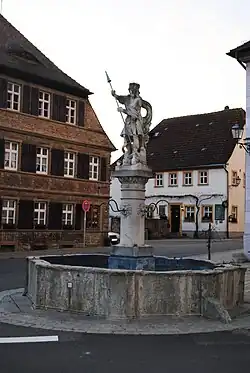 Das Brunnenbecken ist eine achteckige Anlage. An einer Seite ist durch die Wasserzuleitung von Osten her eine Art Pfeiler entstanden. Zentral steht der Brunnenaufsatz, eine runde Säule mit den vier Löwenköpfen, als Reliefs im Becken. Darüber erhebt sich die Figur des heiligen Georg, der eine eiserne Lanze in den Rachen des Drachen stößt. Die Figur ist aus französischem Kalkstein, das Becken besteht aus Steinen aus Randersacker.[5]
