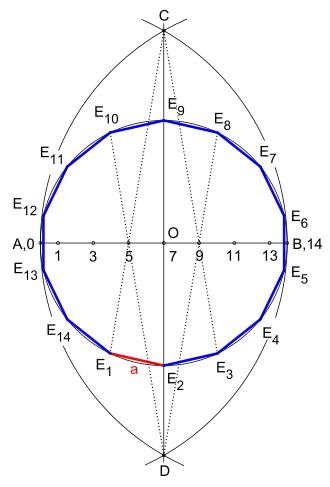 Zuerst wird die Strecke , später der Durchmesser des gesuchten Vierzehnecks, in gleich lange Teile mithilfe des Strahlensatzes geteilt (in der Zeichnung nicht dargestellt) oder mittels Aneinanderreihen von gleich langen Abständen bestimmt. Es werden entweder die geraden oder die ungeraden Zahlen (Teilungspunkte) auf markiert. In diesem Beispiel sind die ungeraden Zahlen und eingetragen, dadurch liegen z. B. die späteren Eckpunkte und nicht in der Nähe des Punktes . Der Teilungspunkt entspricht dem Mittelpunkt des Durchmessers Nun wird um den Mittelpunkt und durch der Umkreis gezogen. Die zwei darauffolgenden Kreisbögen um bzw. mit dem Radius schneiden sich in den Punkten und Nach deren Verbindung erhält man die Mittelachse und als Schnittpunkte die Eckpunkte und des entstehenden Vierzehnecks.