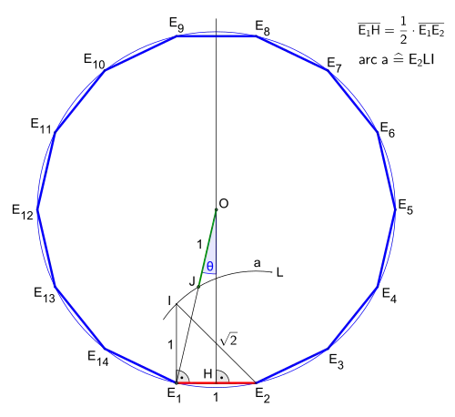 - Verbinde den Punkt mit dem Punkt , der dadurch entstandene Winkel , mit (Theta) bezeichnet, entspricht einem Viertel des Zentriwinkels eines Siebenecks, aufgrund des 2. Strahlensatzes entspricht er auch einer Hälfte des gesuchten Zentriwinkels des Vierzehnecks.