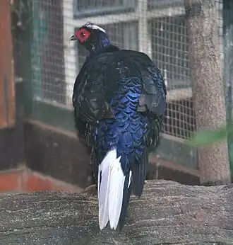 Diese recht kurzschwänzige Fasanenart ist dem Edwardsfasan sehr ähnlich und erreicht eine Körperlänge zwischen 58 und 65 cm. Der Hahn zeigt eine rote unbefiederte Augenregion, eine weiße, teils mit schwarz durchmischte Haube und ist überwiegend blauschwarz gefärbt. Die Federn der Oberseite zeigen glänzend blaue Säume sowie ein subterminales, schwarzes Band. Im Unterschied zu denen des Edwardsfasans sind die beiden mittleren Steuerfedern weiß. Die Beine sind karminrot.