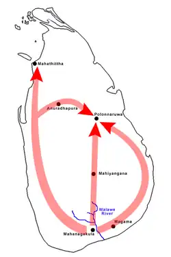 Nachdem sich Vijayabahu I. nach Wakirigala zurückgezogen hatte und dort Kräfte für einen erneuten Angriff zusammenzog, sah er sich rebellischen Singhalesenanführern gegenüber, welche ihm seinen Thron streitig machen wollten. Vijayabahu konnte zwar der Rebellen Herr werden, hatte aber dadurch nicht mehr genügend Kräfte für einen weiteren Angriff auf die von der Chola-Armee besetzte Hauptstadt. Stattdessen erwählte er Katharagama in Ruhuna als neue Hauptstadt und reorganisierte dort seine Truppen.