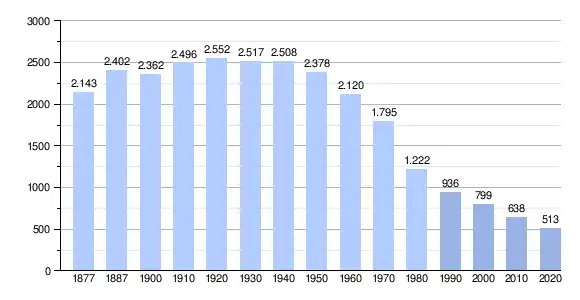 Durch Fortzug in die umliegenden Städte ist die Bevölkerung seit den 1950er Jahren stetig gesunken.