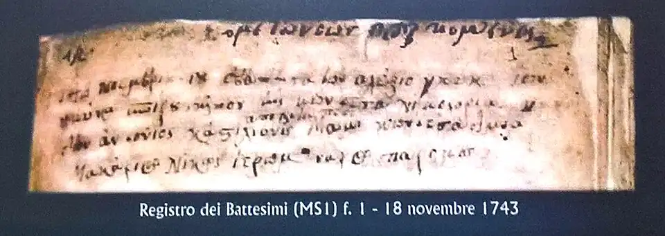 Aus einem alten in Griechisch geschriebenem Taufregister geht hervor, dass das erste Kind Alessio Ngjka (Gica), Sohn von Gica (=Giovanni) Spiro und Contessa Nicolarias (Tochter von Nicola) am 18. November 1743 vom Priestermönch Macario Nikàs in Villa Badessa getauft wurde.[18][29]
