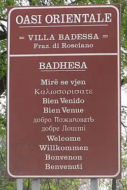 1983 sprachen nur noch drei sehr betagte Personen Arbëresh. Der letzte Arbëreshsprecher aus Villa Badessa starb in den USA.[60] Die Sprache ist auch in der Öffentlichkeit kaum präsent; der Ort ist nicht zweisprachig beschildert und Straßennamen in Arbëresh fehlen.[58] Der einzige Indikator für die albanischsprachige Tradition ist ein mehrsprachiges Willkommensschild in der Nähe des Ortseingangs, auf dem außer der Version in Italienisch auch die in Arbëresh zu lesen ist: „Villa Badessa – Badhesa“ und „Benvenuti – Mirë se vjen“.[62]