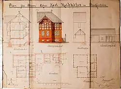 Der Bauherr entschied sich für einen asymmetrischen Grundriss, ein verspieltes Äußeres sowie ein zur damaligen Zeit modernes Stahlbetonfundament (Kellerwände und Kellerdecke). Das Erdgeschoss (Hochparterre) wurde gründerzeittypisch dreireihig, aus roten Klinkersteinen sowie zwei Reihen Backsteinen errichtet. Die Fenster erhielten Sandsteinlaibungen. Der Zugang erfolgt über einen kurzen Treppenaufgang. Die Geschosshöhe ist mit 2,80 m höher als im Obergeschoss. Im Obergeschoss wurde Fachwerkbauweise, bestehend aus Tannenholz mit mittels gelben Backsteinen ausgemauerten Gefachen, gewählt. Die Decken bestehen aus Holz und Lehmwickel, die Raumhöhe beträgt nur 2,50 m.