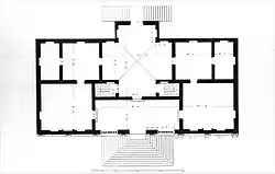 Der Hauptbau besteht aus einem klar umgrenzten Quader mit einer dreifachen Arkade in der Mitte der Fassade. Die Arkade nimmt die gesamte Geschosshöhe des eingeschossigen Baus ein und wird von einem Dreiecksgiebel bekrönt. Ursprünglich war eine breit angelegte Freitreppe geplant. Die schmale Treppe, die aktuell zur Loggia führt, ist ein später zu datierender Zusatz.