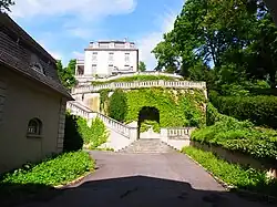 Die Villa erreicht man, indem der Torbogen eines von mehreren Wirtschaftsgebäuden durchquert wird. Es handelt sich dabei um ein versetzt angelegtes Gebäudeensemble. Es gibt die Möglichkeit, über eine Fahrstraße oder über einen Treppenaufgang die Villa zu erreichen. Von der Fahrstraße biegt ein kurviger Treppenzugang zum Plateau der Gartenanlage. Ostseits erreicht man einen Zaun, der das Grundstück von einem der öffentlichen Zugänge zur Karlshöhe abgrenzt.