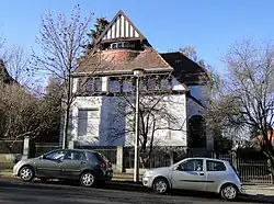 Der Putzbau ist im Heimatstil mit Anklängen an den Jugendstil errichtet worden. Grund- und Aufriss der Villa sind unregelmäßig. Sie besitzt ein hohes Walmdach, das auf der Straßenfront im gleichen Größenverhältnis wie der untere Kubus erscheint. Der Giebel ist in Fachwerk gestaltet, die Fenster haben verschiedene Formen. Charakteristisch ist das im Halbkreis geschwungene Fensterband im oberen Giebelteil und die im unteren Fenstergiebelteil aufgenommene, die Horizontale betonende Fensterreihe.