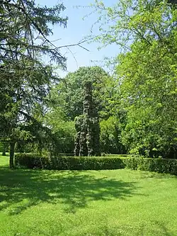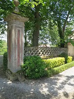 Die den Hof zum Garten abschließende Einfriedung besteht aus zwei Torpfeilern und Balustraden aus Betonelementen im neugotischen Stil. Auch im Garten sind Beton-Objekte aus der Erbauungszeit erhalten: Die Mittelachse der Galerie ist auf ein polygonales Becken ausgerichtet. In dessen Mitte steht eine Fontäne aus Beton. Weiter gibt es in dem Garten eine kleine Beton-Brücke, die zu dessen romantischer Ausstattung gehörte. Sie besteht aus einem flachen Betonbogen auf Backsteinwiderlagern und war auf der Unterseite mit (heute abgebrochenen) Stalaktiten dekoriert.[2] Zusammen mit den Dekorelementen aus Betonstein dürfte es sich bei diesen Objekten um die frühesten bekannten Beispiele handeln. Die Brüder Lebrun besaßen in Marssac-sur-Tarn eine Fabrik, die solche Dekorationselemente aus Kunststein herstellte.[3]