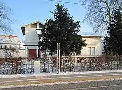 Der im italienisierenden Landhausstil errichtete Putzbau ist ein- und zweigeschossig mit flachen Satteldächern. Die zur Puschkinallee giebel- und traufständigen Bautrakte stehen im rechten Winkel zueinander. Der Nordwestecke ist eine Terrasse mit Pergola vorgelagert. Über den hochrechteckigen Fenstern sind horizontale Verdachungen angebracht. Der Eingangsbereich liegt auf der Rückseite des eingeschossigen Gebäudetrakts.[3]