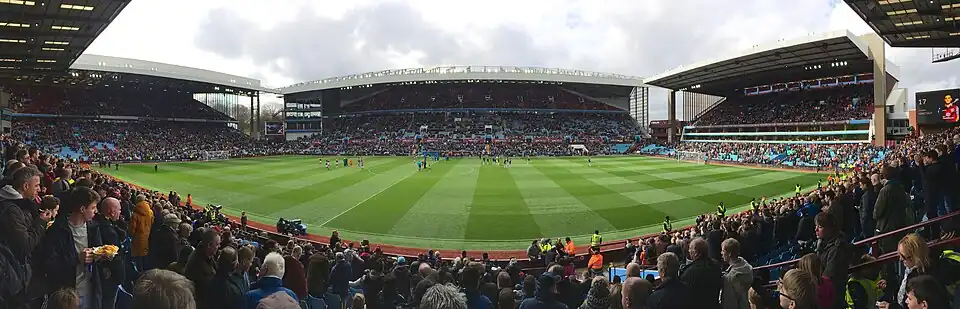 Der Villa Park ist ein Fußballstadion in der zweitgrößten britischen Stadt Birmingham, West Midlands, England. Der Fußballverein Aston Villa ist Eigentümer und Hauptnutzer der Spielstätte mit 43.205 Sitzplätzen.[1] Die vier Tribünen sind der 1994 eröffnete Holte End im Süden mit einer Kapazität von 13.500 Plätzen, Trinity Road im Westen (bestehend aus drei Rängen und einer Reihe Logen), Doug Ellis Stand im Osten (zwei Ränge) und North Stand aus den späten 1970er Jahren im Norden (zwei Ränge unterbrochen von einer Reihe Logen).