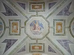 In den Innenräumen befinden sich Fresken, die laut Palladio von „Meister Bernardino Indio & Meister Anselmo Canera, Malern aus Verona“ ausgeführt wurden.[3] Im Gewölbekreuz der Loggia finden sich allegorische Gestalten. Im Kaisersaal auf der Villensüdseite sind Darstellungen aus der römischen Geschichte sowie eine gemalte Naturlandschaft zu sehen. Die Malereien in den anderen Räumen sind etwas bescheidener. In der Loggia befindet sich darüber hinaus eine Marmorbüste des Bauherrn.[4][5]