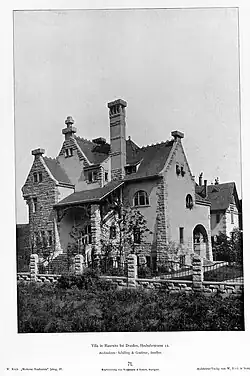 Das Gebäude galt in der Fachwelt als „Höhepunkt des neuen Bauens“.[2] Dem Jugendstil gehöre nur die sparsame florale Ornamentik an den Giebelabschlüssen und am Schornstein an. Die „kraftvoll und ein wenig dramatisch“ wirkende Villa wird von Volker Helas dem „monumentalen Materialstil“[2] zugeschrieben, der „wie der Jugendstil eine Strömung der Reformarchitektur“[2] sei. Die wenige ornamentale Behandlung im Jugendstil sei stilistisch mit dem Gebäude der Sächsischen Handelsbank in der Dresdner Innenstadt verwandt. Auch die Fachpresse schreibt die Villa dem Materialstil der Reformarchitektur zu: Die Architekten hätten den überkommenen Historismus aufgegeben um sich der neuen Architektur mit ihren regionalen Baustoffen zu widmen – „die Architekten [haben] die Bahnen der künstlerischen Überlieferung … verlassen [um] aus den Eigenschaften der Baustoffe gegebenen Bedingungen heraus selbständig, im neuen Sinne zu entwickeln“. Es sei deswegen das „eigenartigste Wohnhaus … das … in ganz Deutschland entstanden“ sei.[3]