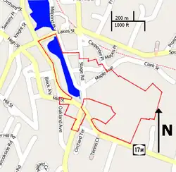 Am deutlichsten ist die Westgrenze des historischen Distrikts, die an der New York State Route 17M entlang von der Lake Street bis zu einem Punkt etwa einen Kilometer westlich der Kreuzung mit der Stage Road führt. Einige Gebiete westlich der State Route sind allerdings Teil des historischen Distrikts, vor allem an der Stage Road, aber auch Abschnitte an Oakland, Mill und Ramapo Street. Östlich der State Route 17M sind zwei große Grundstücke nordöstlich der Kreuzung mit der Stage Road nicht Teil des historischen Distrikts.[2] Im Osten folgt die Grenze des Bezirks der westlichen Seite des Mill Pond Parkways südlich der Lake Street, führt dann an der Südseite von Smithfield Court nach Osten und dann an der Westseite der Stage Street für eine kurze Strecke nach Süden. Über einen Zickzackkurs führt die Umrandung des historischen Distrikts dann zur Kreuzung von Carpenter Place und Maple Street und von dort aus südwärts, um den Monroe Cemetery einzuschließen und schließlich nach Westen zur Stage Street und zur NY 17M zurückzuführen.[2]