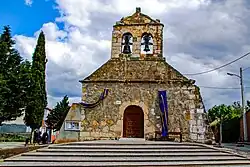 - Die kleine Dorfkirche von Carpio-Bernardo verfügt ebenfalls über einen zweigeteilten Glockengiebel; das Portal befindet sich jedoch unmittelbar darunter.