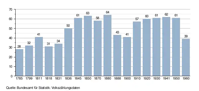 - ↑ Daten der Eidgenössischen Volkszählungen ab 1850 nach Gemeinden. (XLSX; 10 MB) Bundesamt für Statistik, Neuchâtel, 12. Juli 2024, abgerufen am 9. Mai 2025 (Öffnung in Excel nur über "Anhang/Excel-Datensatz" möglich).