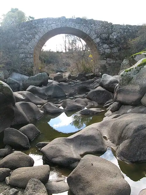 - Etwa 2 km östlich quert eine mittelalterliche Rundbogenbrücke den Río Pedroso.