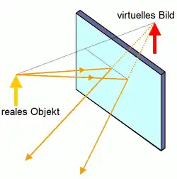 - Das Spiegelbild bei einem ebenen Spiegel. Es befindet sich hinter dem Spiegel (auch wenn dort eine Wand ist) im gleichen Abstand wie das Objekt und hat die gleiche Größe wie dieses (auch wenn der Spiegel viel kleiner ist).