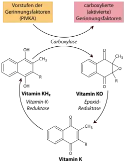Das Epoxid des Vitamin K wird anschließend mittels einer membranständigen Vitamin-K-Epoxid-Reduktase (VKORC1) zum Chinon des Vitamin K zurückverwandelt und der Zyklus kann von Neuem beginnen. Durch diese Wiederverwertung ist der physiologische Bedarf an Vitamin K vergleichsweise gering.