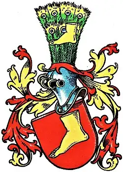 Blasonierung: In Rot ein nach rechts gerichteter bloßer Fuß. Auf dem Helm ein grüner Pfauenbusch, davor der Fuß. Die Helmdecken sind rot-golden.[3]