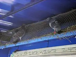 - Jede Stadttaube produziert pro Jahr zehn bis zwölf Kilogramm Kot, der ätzend wirkt und nicht nur historische Bausubstanz, sondern auch Stahlkonstruktionen schädigen kann.[21] Durch Nistmaterial und Kot verstopfte Dachrinnen können zu Durchfeuchtungen führen.
