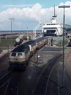 Bis 1993 wurden die Züge verladen, indem die Lok im Hafen abgekuppelt und die Wagen von einer weiteren Lok auf das Fährschiff geschoben wurden. Im Zielhafen zog eine andere Lok die Wagen zur Weiterfahrt vom Schiffsdeck. Mit der Einführung der dieselelektrischen IC3-Züge[14] konnte das Rangieren entfallen. Dasselbe Verfahren war bereits in den späten 1950er und 1960er Jahren mit den seinerzeit von der Deutschen Bundesbahn eingesetzten VT-12.5-Triebzügen praktiziert worden. Die dänischen IC3-Züge bedienten bis zum Fahrplanwechsel am 15. Dezember 2019 den gesamten Eurocity-Verkehr zwischen Kopenhagen und Hamburg. Die nach dem Fahrplanwechsel 2007 eingesetzten ICE-TD-Triebzüge der Deutschen Bahn sind seit Oktober 2017 nicht mehr in Betrieb. Nach Einstellung des Eisenbahntrajekts auf der Vogelfluglinie im Dezember 2019 werden alle Fernverkehrszüge zwischen den Metropolen Hamburg und Kopenhagen über die Jütlandlinie, also über die Strecke Flensburg–Kolding–Odense und die Große-Belt-Querung geleitet.