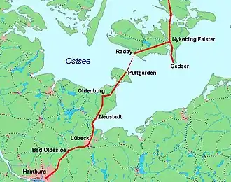 Von Kopenhagen geht der Weg über die elektrifizierte[39] zweigleisige[40] Bahnstrecke København–Ringsted (Teil der „Vestbanen“) und ab Ringsted weiter auf der nicht elektrifizierten zweigleisigen Bahnstrecke Ringsted–Rødby Færge („Sydbanen“) bis Vordingborg. Eine eingleisige Strecke führt über die kleine Masnedsundbro und Storstrømsbro bei Masnedø auf die Insel Falster, wo in Nykøbing/F früher der Eisenbahnverkehr nach Gedser und Rødbyhavn geteilt wurde. Zum Fährhafen Rødby Færge überquert der Schienenweg über die Kong Frederik d. IX’s Bro den Guldborgsund auf die Insel Lolland.