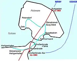 Unmittelbarer Vorläufer der Fährverbindung Puttgarden–Rødby war die 69 km lange Verbindung über die Eisenbahnfähre Großenbrode–Gedser von 1951 bis 1963, ab Beginn mit den alten dänischen Dampffähren Danmark und Prins Christian, seit 1953 auch mit dem neuen Fährschiff Deutschland der Deutschen Bundesbahn.[11]
