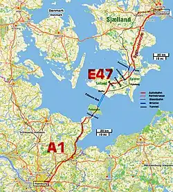 Zur Beschleunigung des Verkehrs mit Dänemark wurde gegenüber der Jütlandlinie die Vogelfluglinie anstelle einer festen Rostock-Gedser-Querung favorisiert. Es wurde geplant, bis 2021 eine feste Fehmarnbelt-Querung einzurichten. Lange Zeit blieb ungewiss, ob dies eine Brücke oder ein Tunnel werden würde. Am 3. September 2008 wurde der für das Vorhaben notwendige Staatsvertrag zwischen Deutschland und Dänemark geschlossen.[49] Bauherr und Betreiber der Fehmarnbeltquerung wird die dänische Betreibergesellschaft Femern A/S sein. Die Baukosten von ca. 5,5 Mrd. Euro (2008) sollen durch Mautgebühren in Höhe heutiger Schiffspassagekosten refinanziert werden.[50] Das Angebot einer chinesischen Beteiligung wurde im Oktober 2012 von der Femern A/S abgelehnt.[51]