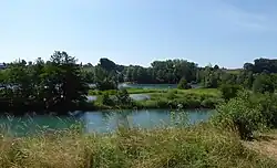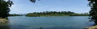 Die Insel ist 30 Meter vom linken (nördlichen) Flussufer entfernt, und 115 Meter vom rechten. Sie ist rund 292 Meter lang und maximal 78 Meter breit. Die Flächenausdehnung beträgt 1,2 Hektar. Bei niedrigem Wasserstand erweitern Schlickflächen die Nahrungsgrundlage für Vögel, speziell für Limikolen.