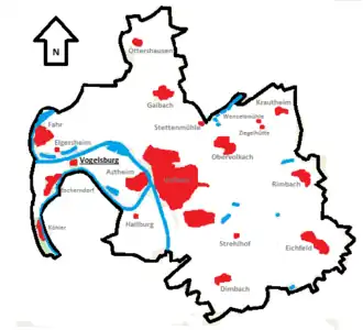 ![]() Lage der Vogelsburg (fett) innerhalb des Volkacher Gemeindegebietes