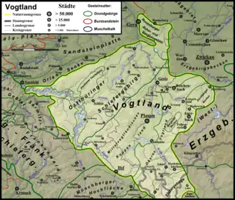 - Die überwiegend sächsischen Haupteinheiten Mittelvogtländisches Kuppenland und Oberes Vogtland im südöstlichen Teil werden in der Gliederung Naturräume in Sachsen der Sächsischen Akademie der Wissenschaften unter Vogtland, inzwischen mit dem Elstergebirge als eigener Einheit, der Übereinheit Sächsisches Bergland und Mittelgebirge zugerechnet, wobei Randanteile des Ostthüringer Schiefergebirges (v. a. um Pausa/Vogtland) einbezogen werden, nicht jedoch die Randanteile am Ronneburger Acker- und Bergbaugebiet.[3]