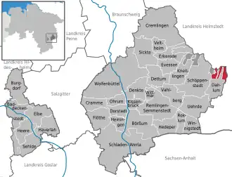 Darüber hinaus bestehen Grenzen zur Gemeinde Schöppenstedt und zum gemeindefreien Gebiet Barnstorf-Warle (im Westen) im gleichen Landkreis sowie zum gemeindefreien Gebiet Brunsleberfeld und zur Gemeinde Räbke (im Norden) sowie zum gemeindefreien Gebiet Schöningen (im Osten) im Landkreis Helmstedt.