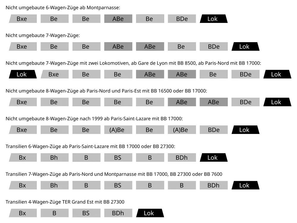 Von Montparnasse aus wurden die Wagen auf den Strecken nach Rambouillet, Dreux und Mantes-la-Jolie eingesetzt. Diese Wagen verkehrten als Wendezüge mit der Baureihe BB 27300.