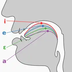 Zur Darstellung aller Vokale wird das sogenannte Vokaldreieck oder Vokaltrapez benutzt (siehe Abbildung). Darin sind die Vokale in der Senkrechten nach dem zu ihrer Bildung notwendigen Grad der Öffnung des Mundraums von offen (a-Laut) nach geschlossen (i-, u-Laut) angeordnet. In der Waagerechten werden sie in vorne (e-, i-Laute) oder hinten (o-, u-Laute) im Mundraum entstehend unterteilt. Sie heißen dementsprechend Vorderzungenvokale bzw. Hinterzungenvokale.