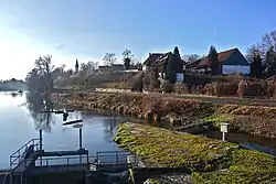 Am südlichen Ortsrand verläuft die St 2045 und parallel dazu die Bahnstrecke München–Regensburg. Unterhalb der Brücke nach Volkmannsdorferau mündet die Amper in die Isar. Unmittelbar vor der Mündung wird der Klötzlmühlbach von der Amper abgeleitet.