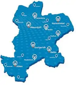 Das Geschäftsgebiet erstreckte sich über den Ostteil des Kreises Warendorf sowie über den westlichen Teil des Kreises Gütersloh. Im Geschäftsgebiet wurden 27 Geschäftsstellen unterhalten. Davon waren fünf Hauptstellen, vier Filialen und 18 SB-Filialen. Neben dem juristischen Sitz der Genossenschaft in Warendorf gab es Niederlassungen in Ahlen, Beelen, Clarholz, Ennigerloh, Harsewinkel, Neubeckum, Oelde, Sassenberg und Warendorf.[5]