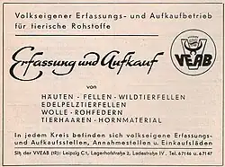 Gemäß Anordnung vom 29. März 1949 Nr. 45 und Verordnung vom 14. Dezember 1950 Nr. 46 wurden Volkseigene Erfassungs- und Aufkaufbetriebe eingerichtet, die mit ihren Bezirks- und Kreiskontoren in der „Vereinigung der Volkseigenen Erfassungs- und Aufkaufbetriebe“ (VVEAB) zusammengeschlossen wurden.[1]S. 56