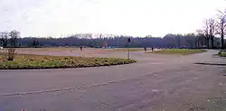 2015 wurde auf dem Platz ein Lager aus Wohncontainern für Flüchtlinge vorwiegend aus Syrien, Irak, Iran und Afghanistan eingerichtet. Die Erstaufnahmeeinrichtung bot Platz für 900 Menschen und wurde seit dem 12. September 2015 im Auftrag des Landes Schleswig-Holstein vom Deutschen Roten Kreuz betrieben.[2] Im November 2015 wurde entschieden, die Zahl der Container auf 357 zu erhöhen, sodass 1500 Flüchtlinge untergebracht werden konnten.[3] Ende Juni 2016 lebten noch 100 Menschen auf dem Gelände, nachdem Lübeck weniger Geflüchtete zugewiesen worden waren und die Hansestadt über andere Unterkünfte verfügte.[4][5] Im August 2016 lebten noch 22 Menschen dort. Im August 2016 wurde sie geschlossen. 2992 Menschen aus 20 Nationen lebten in einem Zeitraum von elf Monaten in der Erstaufnahmeeinrichtung, darunter 575 Kinder. Die Flüchtlinge wurden von 300 ehrenamtlichen Helfern betreut.[6]