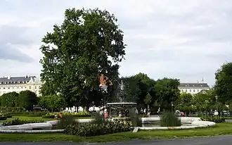 - Kaiserin Elisabeth-Denkmal: Marmordenkmal von Hans Bitterlich nach Entwürfen von Friedrich Ohmann.[8] 1907 in Anwesenheit von Kaiser Franz Joseph I. enthüllt. Die Figur der Kaiserin wurde aus einem 8000 kg schweren Block Laaser Marmors geschaffen und misst 2,50 m Höhe. Die vor einer halbrunden Wand aufgestellte Statue blickt auf einen von Bänken und Brunnen umgebenen Teich mit zwei Springbrunnen.[9]
