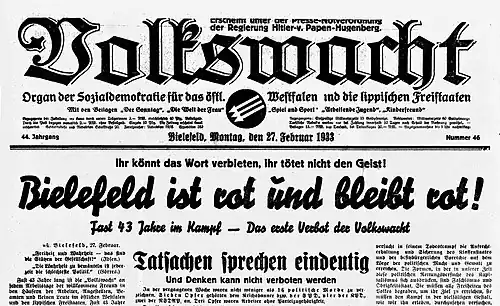 - Bernd J. Wagner: 28. Februar 1933: Verbot der sozialdemokratischen Tageszeitung „Volkswacht“. In: Historischer „RückKlick“. Stadtarchiv Bielefeld, 2013, abgerufen am 7. August 2019.