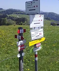 - ↑ Schilder mit grünem Rand und eben dem Titel am Weg in Ö, Website Österr. Weitwanderweg 04 und Maximilianswegdes ÖAV.