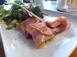 Hafaloab, eine Art Knödel aus gekochten Kartoffeln, Grieß, Riebelmais, Milch, Salz und Butter. Der Hafaloab wird als Beilage zum Schweinsbraten serviert. Eine Variante ist mit Speck gefüllt.[4]